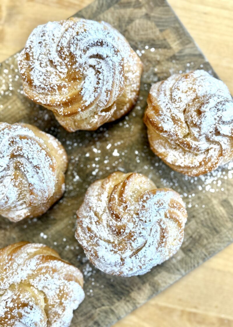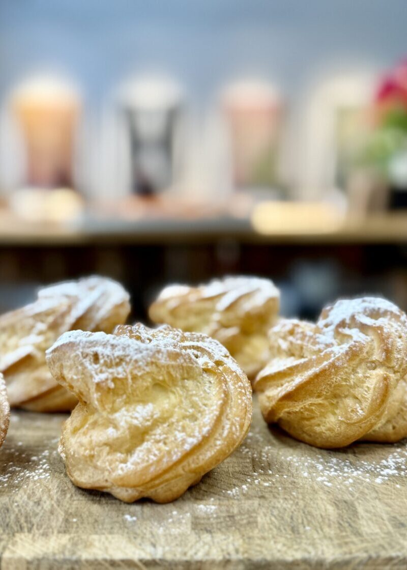 Käsitööna valmistatud õhuline keedutainast saiake, mis on täidetud värske toorjuustu-kohupiimakreemiga.